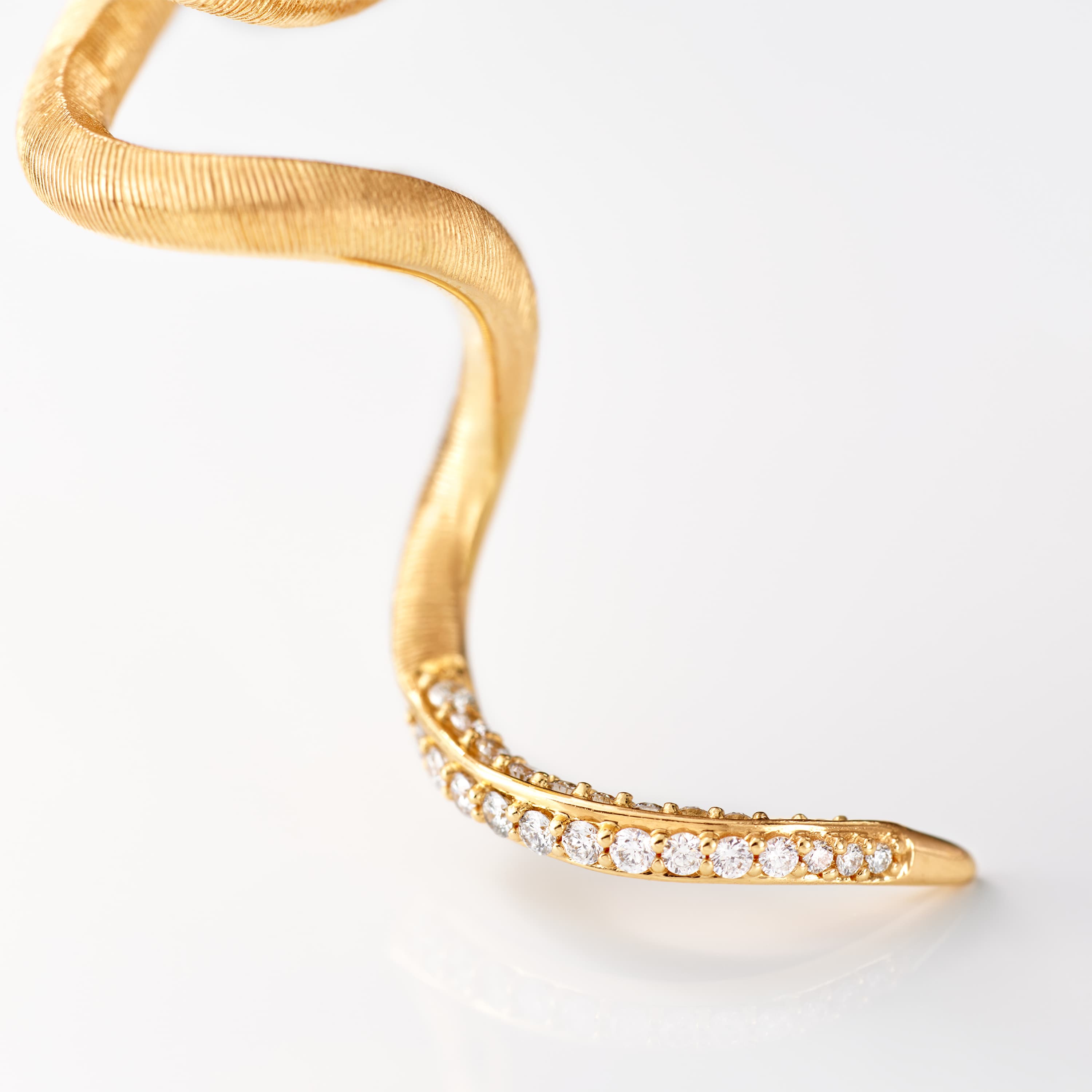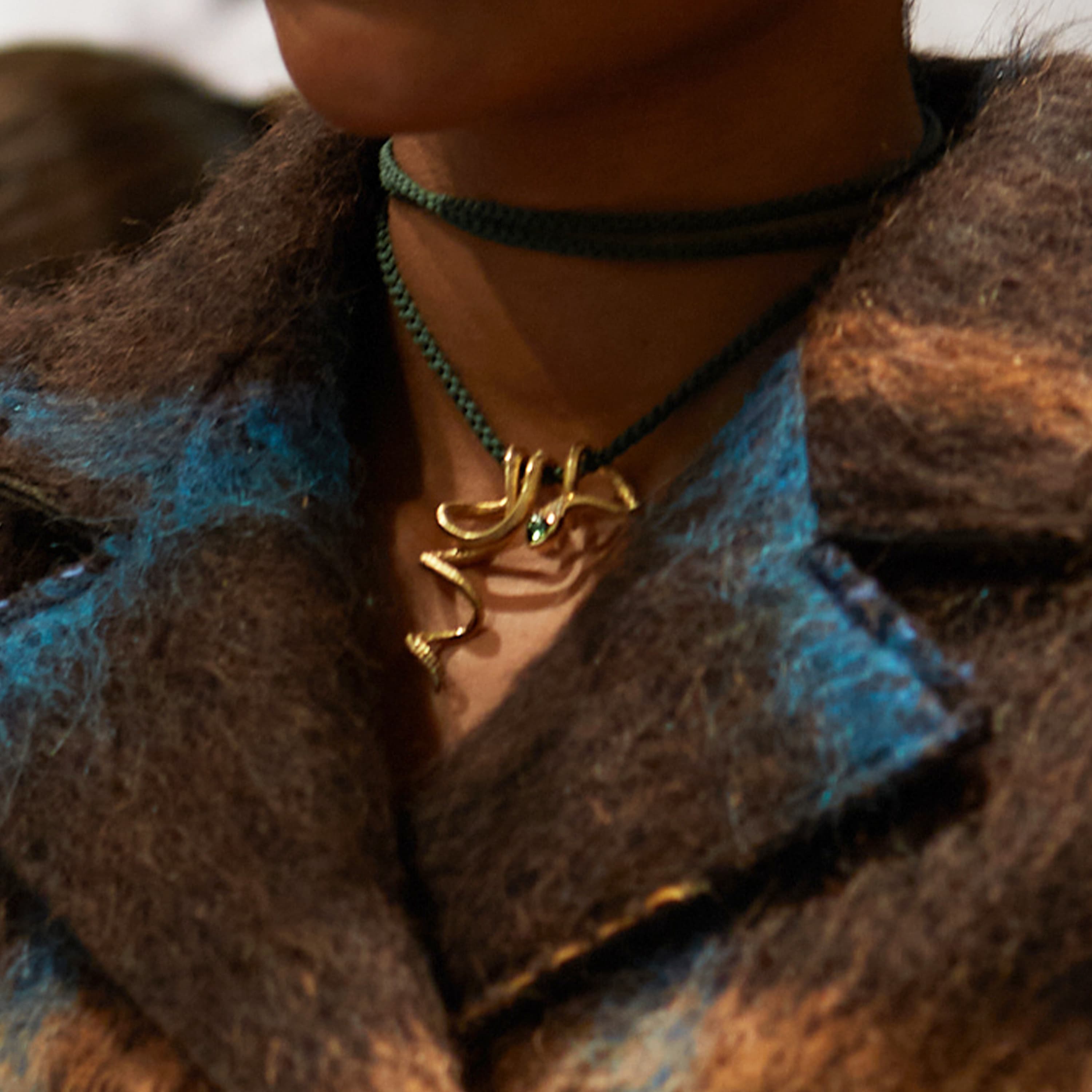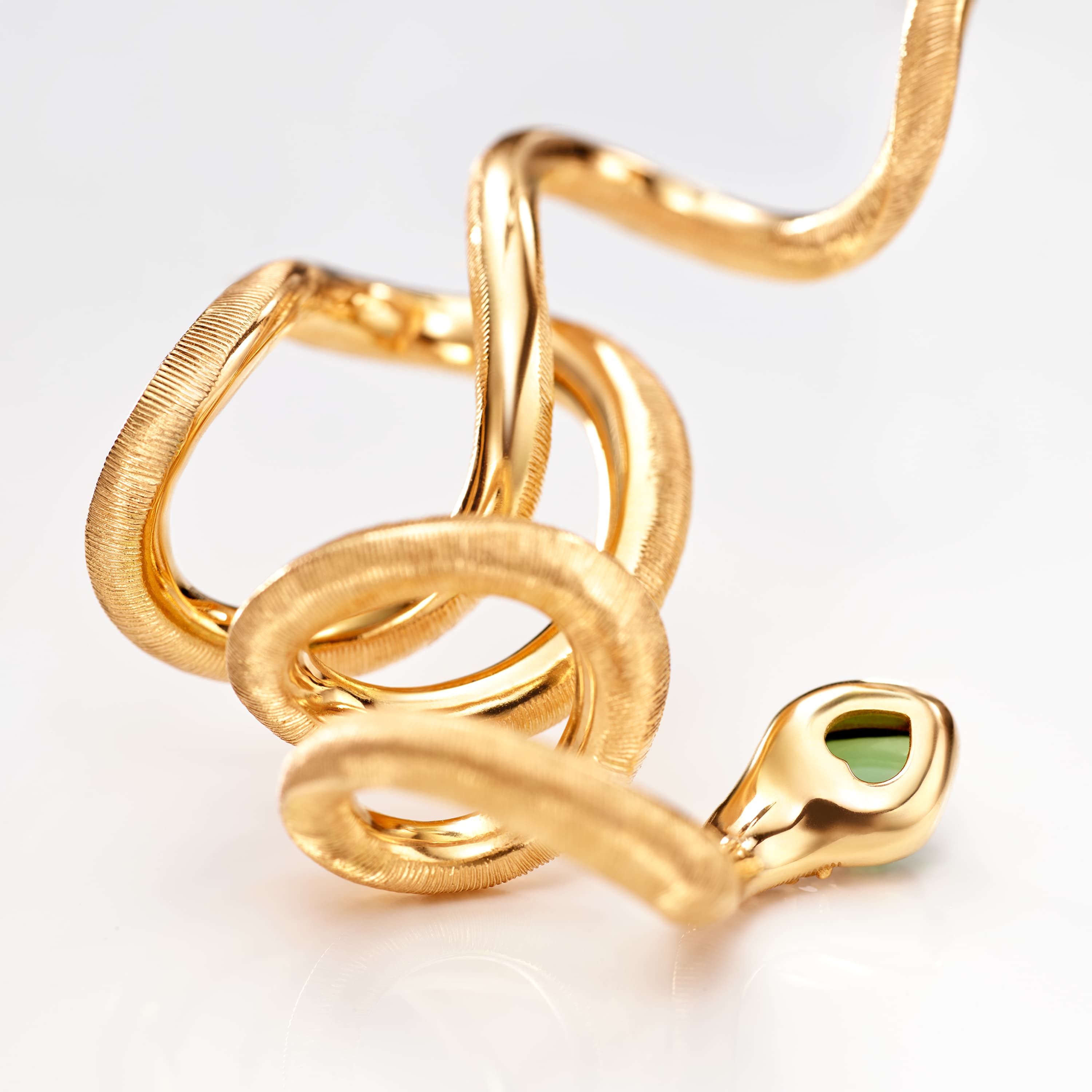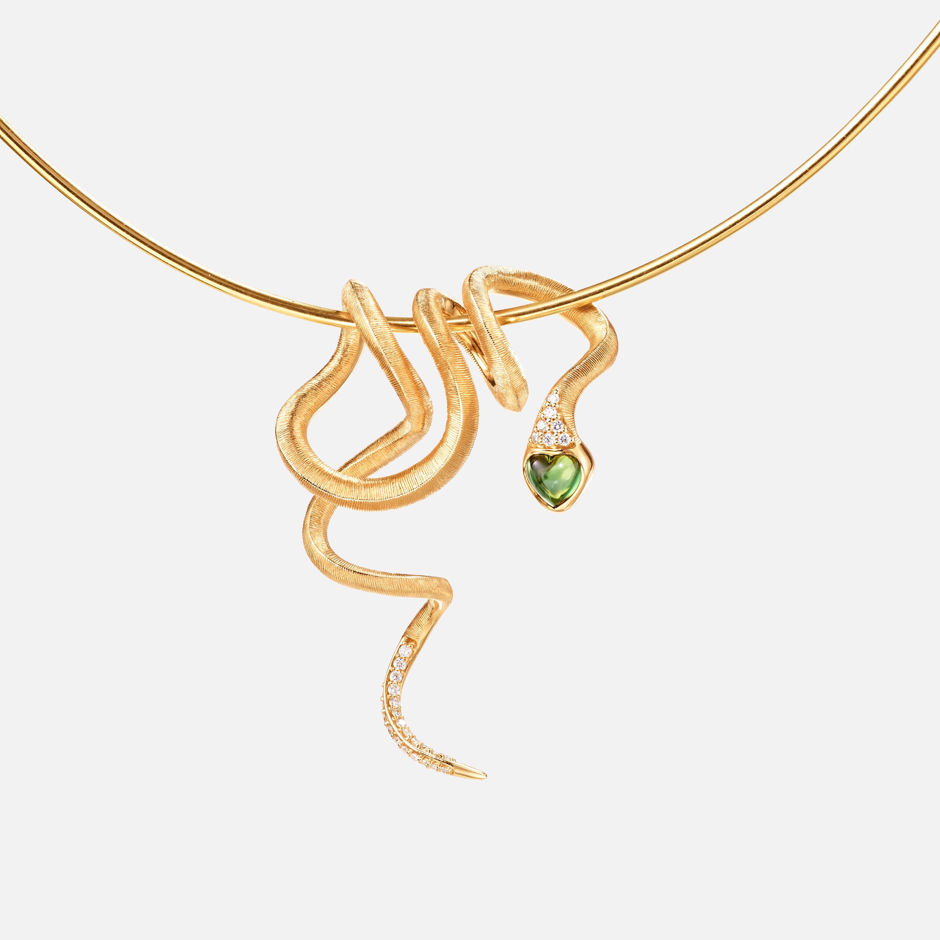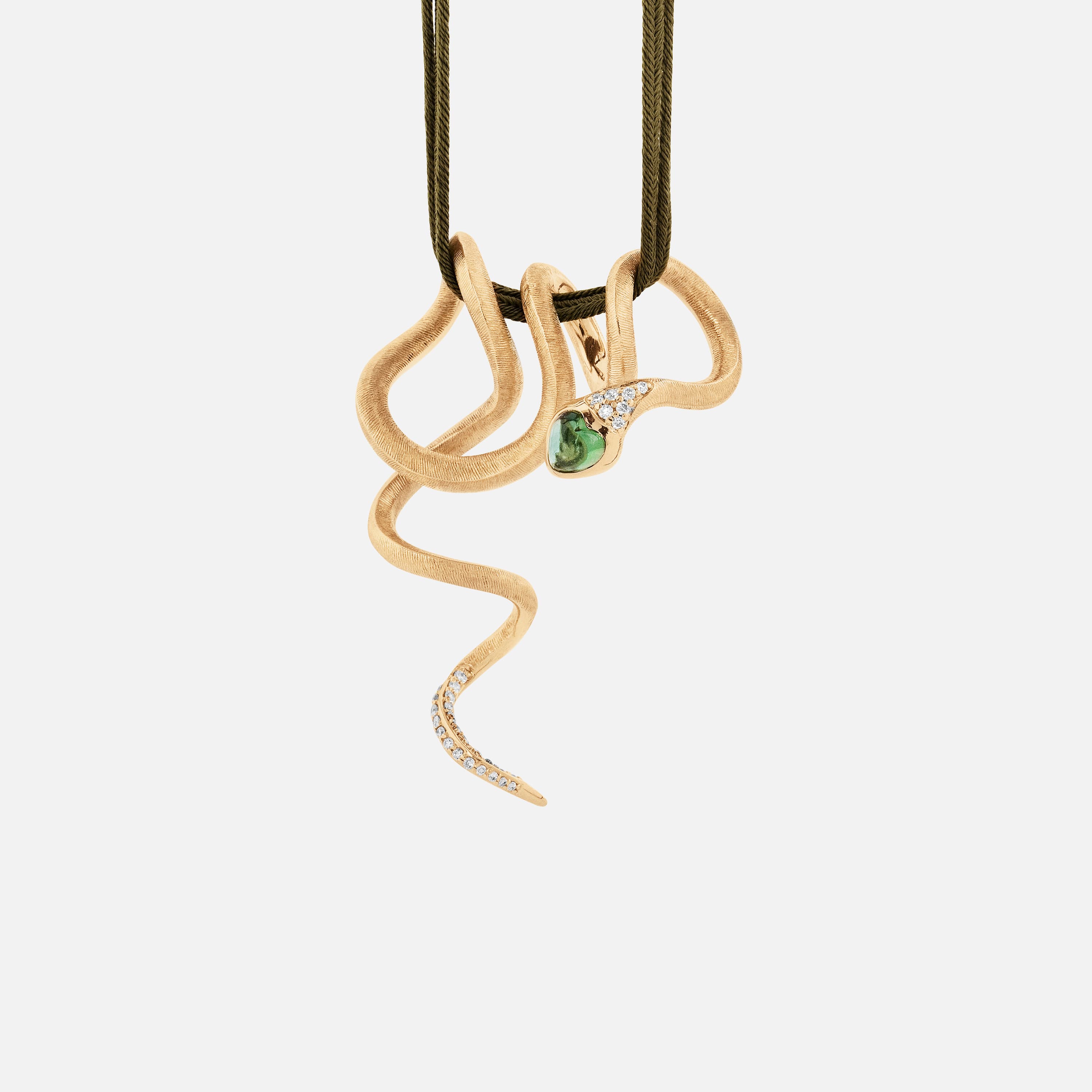 Designed by Ole Lynggaard, the Snakes pavé diamond and tourmaline pendant is crafted from 18 karat yellow gold, with 38 pavé-set diamonds totalling 0.19 carat TW. VS. and a heart-shaped, green 0.8 carat tourmaline. The knotted cord is dark green with hand-satinised, 18 karat yellow gold tips. Handcrafted by master goldsmiths, the visible gold surfaces are hand-satinised, and the cord tips stamped. Part of the Snakes Collection.
