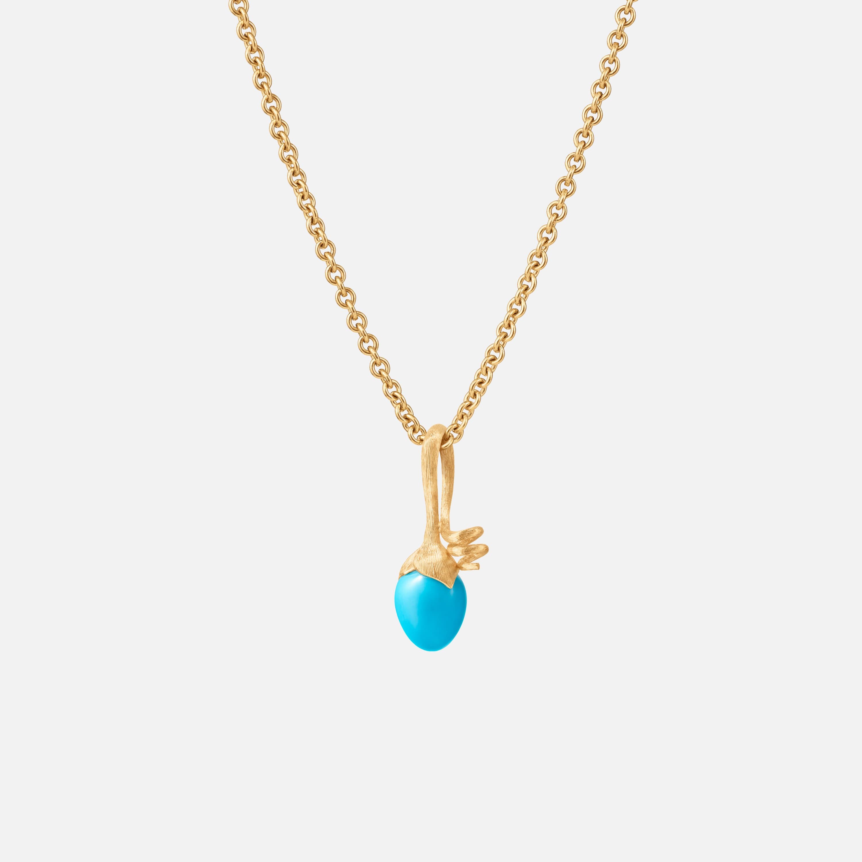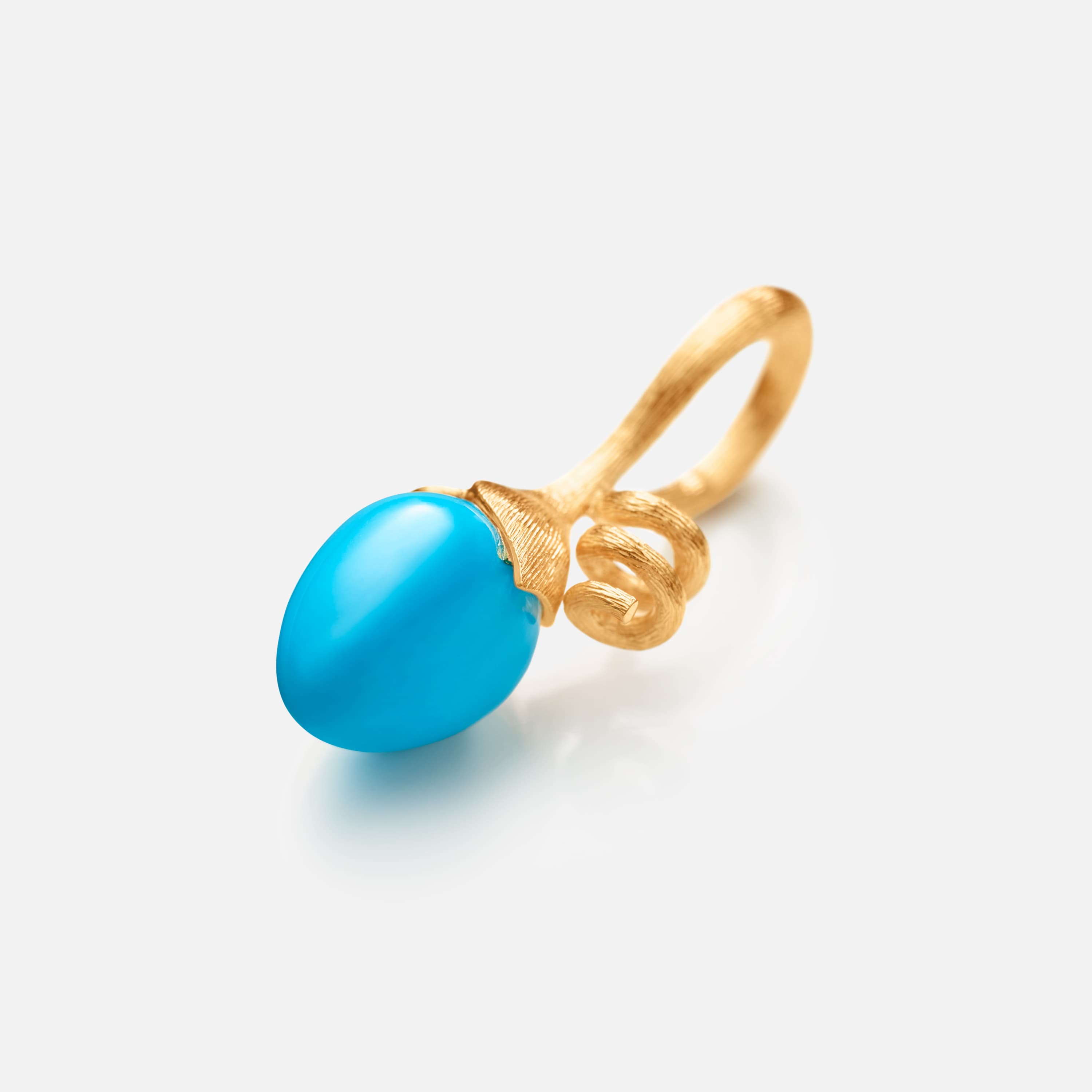 Designed by Charlotte Lynggaard, the Lotus Sprout pendant is crafted from 18 karat yellow gold with a turquoise drop. The gold surfaces are hand-satinised by master goldsmiths using hardened steel engraving tools. Part of the Lotus Collection.