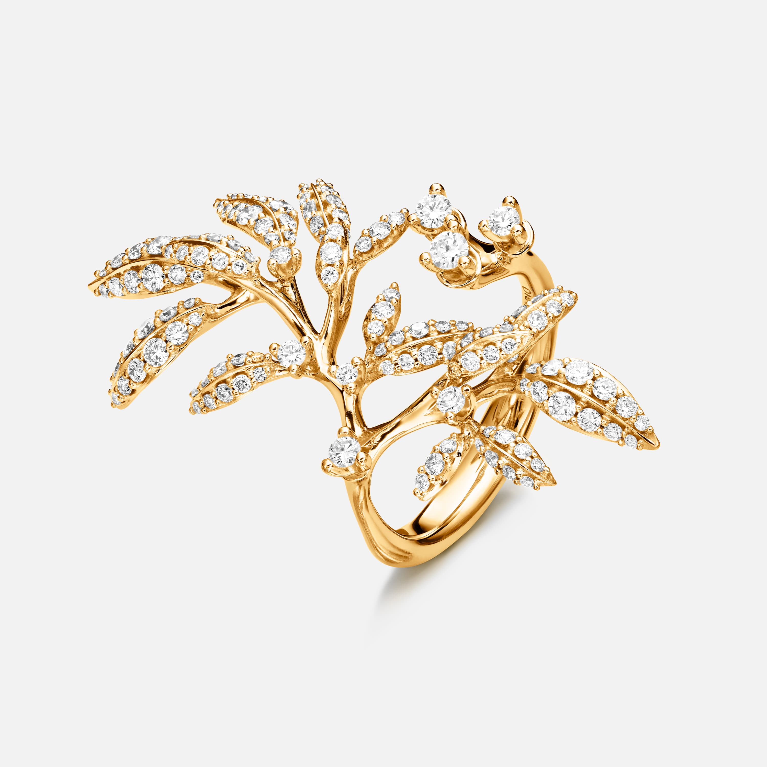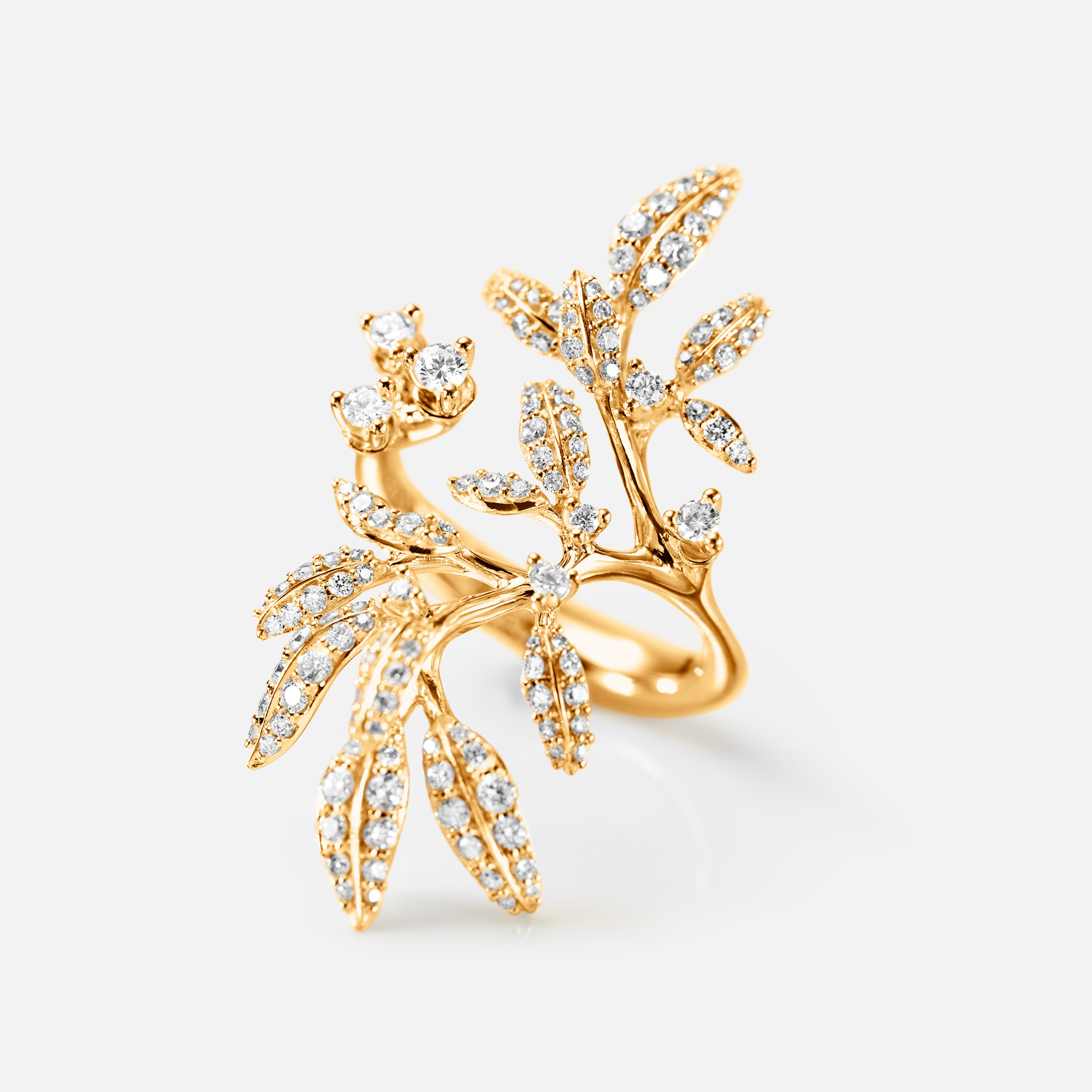 Designed by Charlotte Lynggaard, the Winter Frost ring large is crafted from 18 karat yellow gold and set with 121 diamonds totalling 1,05 carat TW.VS. The diamonds, which are of varying sizes, are hand-set by master goldsmiths to follow the shape of the leaves. Part of the Winter Frost Collection.