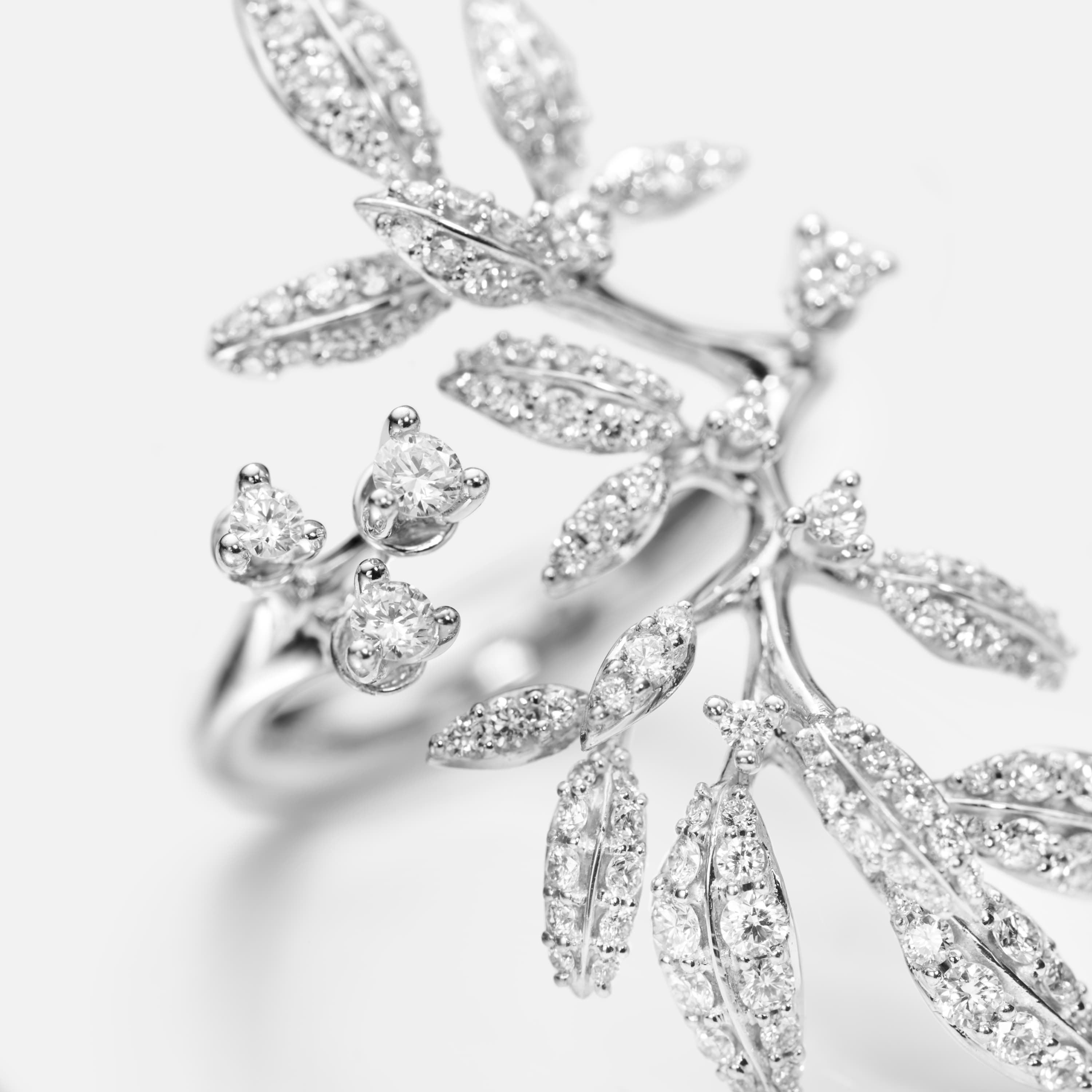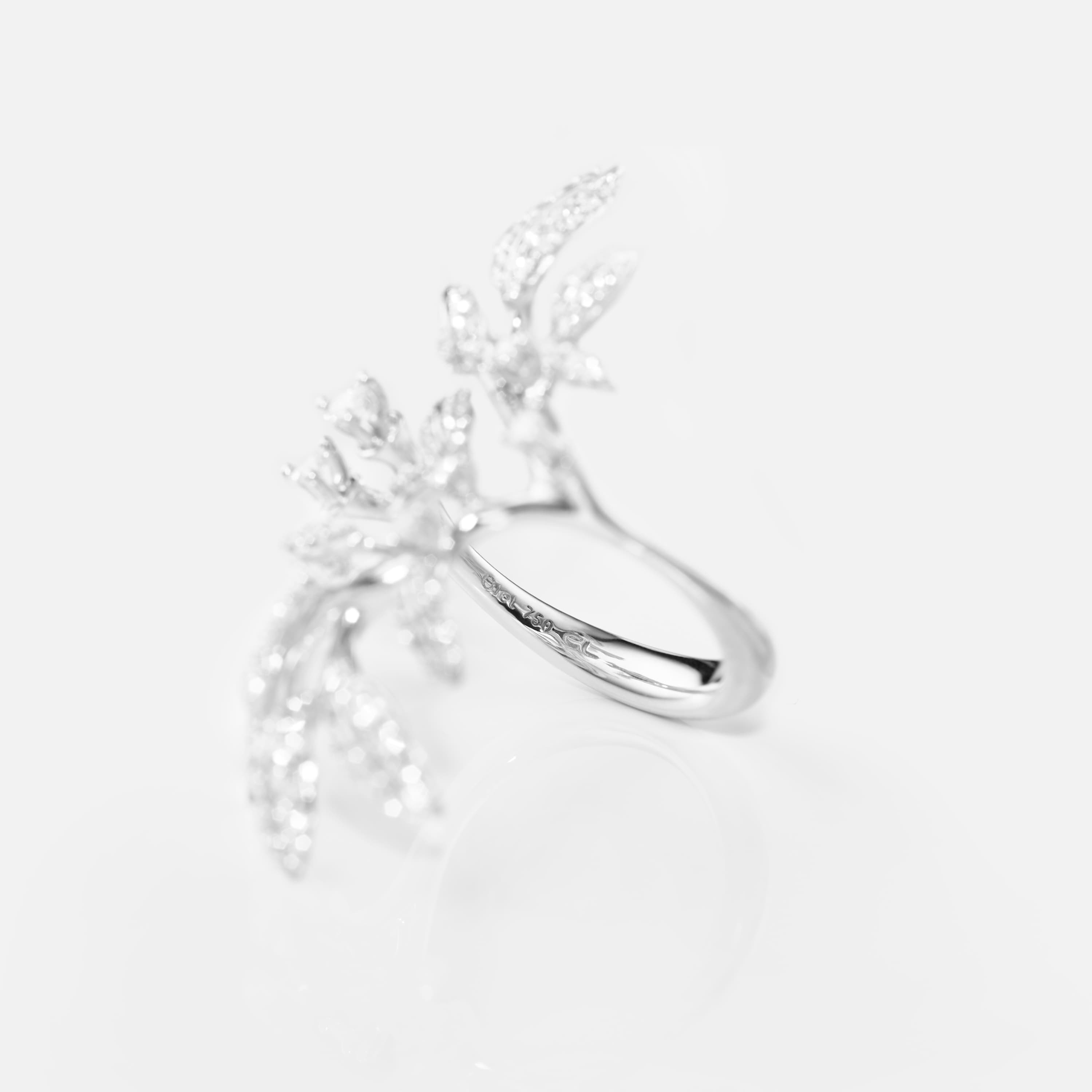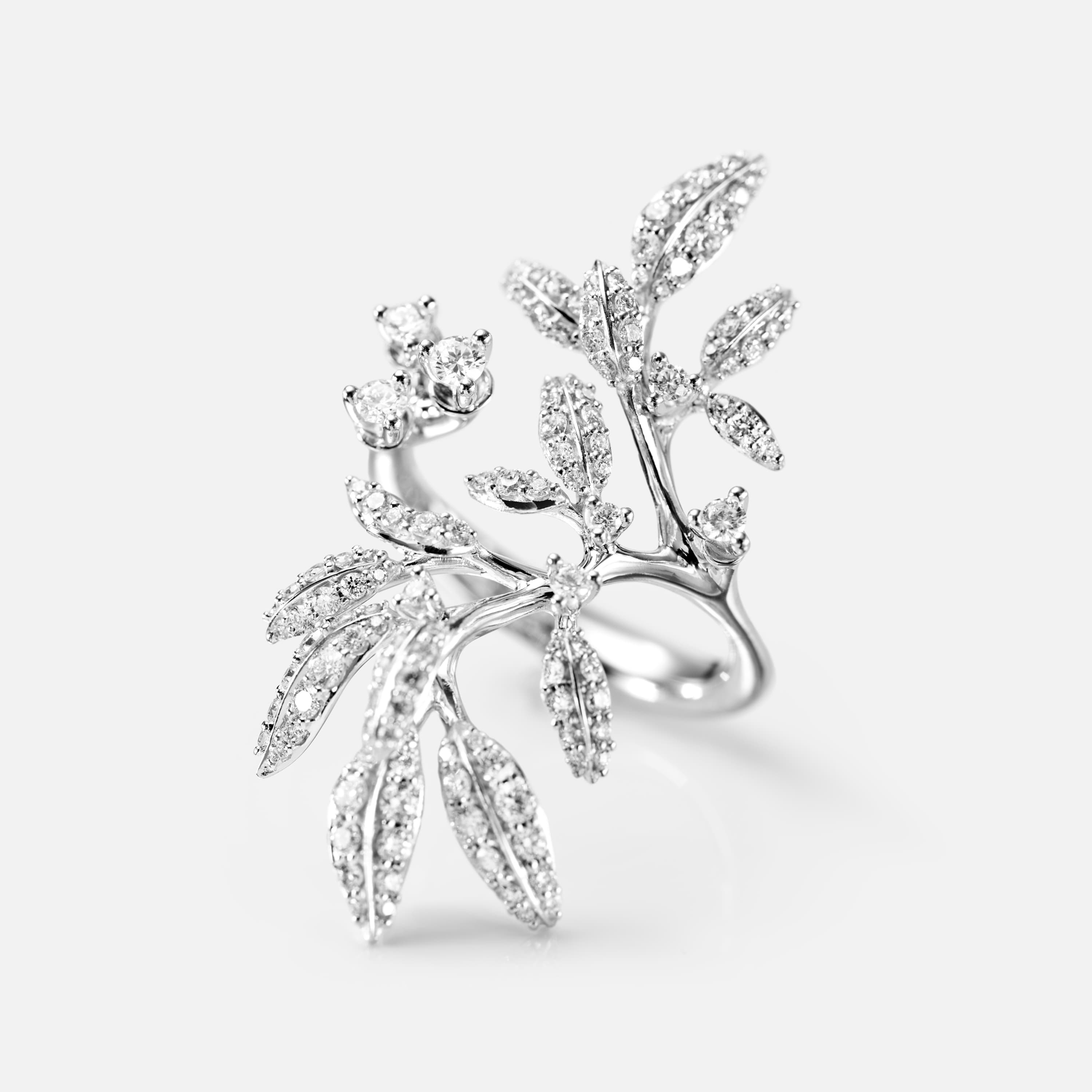 Designed by Charlotte Lynggaard, the Winter Frost ring large is crafted from 18 karat white gold and set with 121 diamonds totalling 1,05 carat TW. VS. The diamonds, which are of varying sizes, are hand-set by master goldsmiths to follow the shape of the leaves. Part of the Winter Frost Collection.