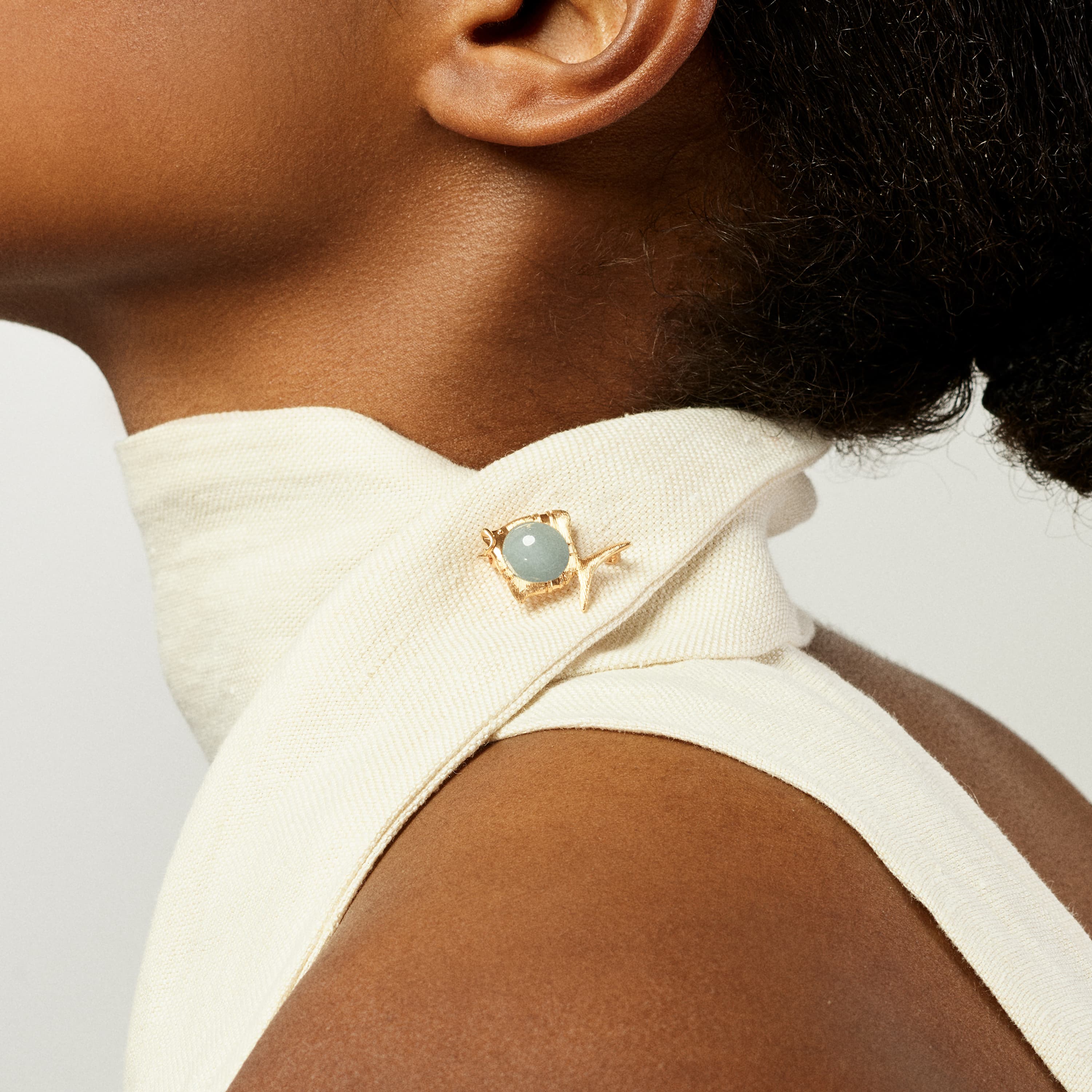 Designed by Sofia Lynggaard Normann, this Young Fish brooch is crafted from 18 karat yellow gold set with an aquamarine. The gold's surface is meticulously satinized by hand, resulting in a uniquely textured finish. The aquamarine is 11 mm in diameter. Pendants are sold separately. Part of The Young Fish Collection.