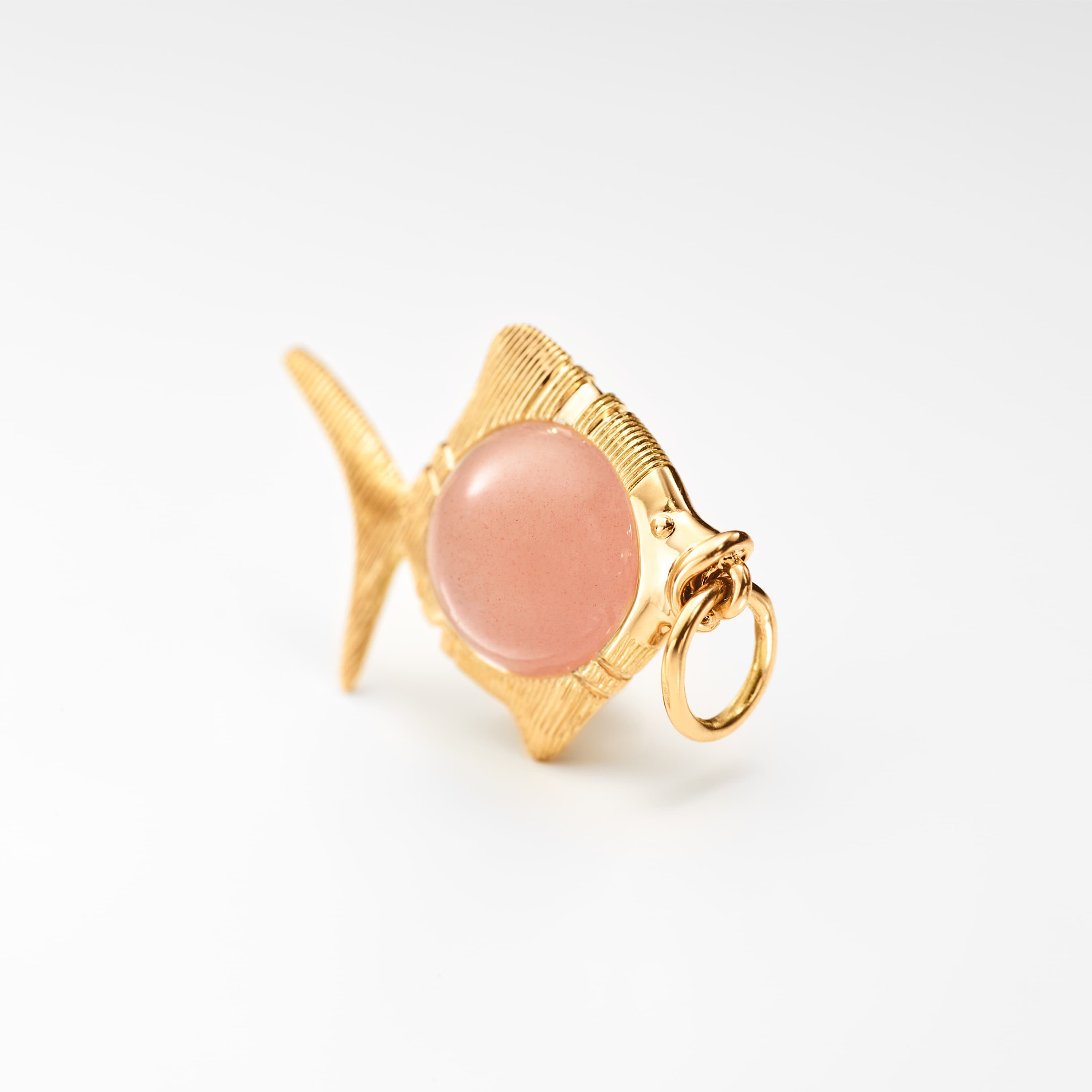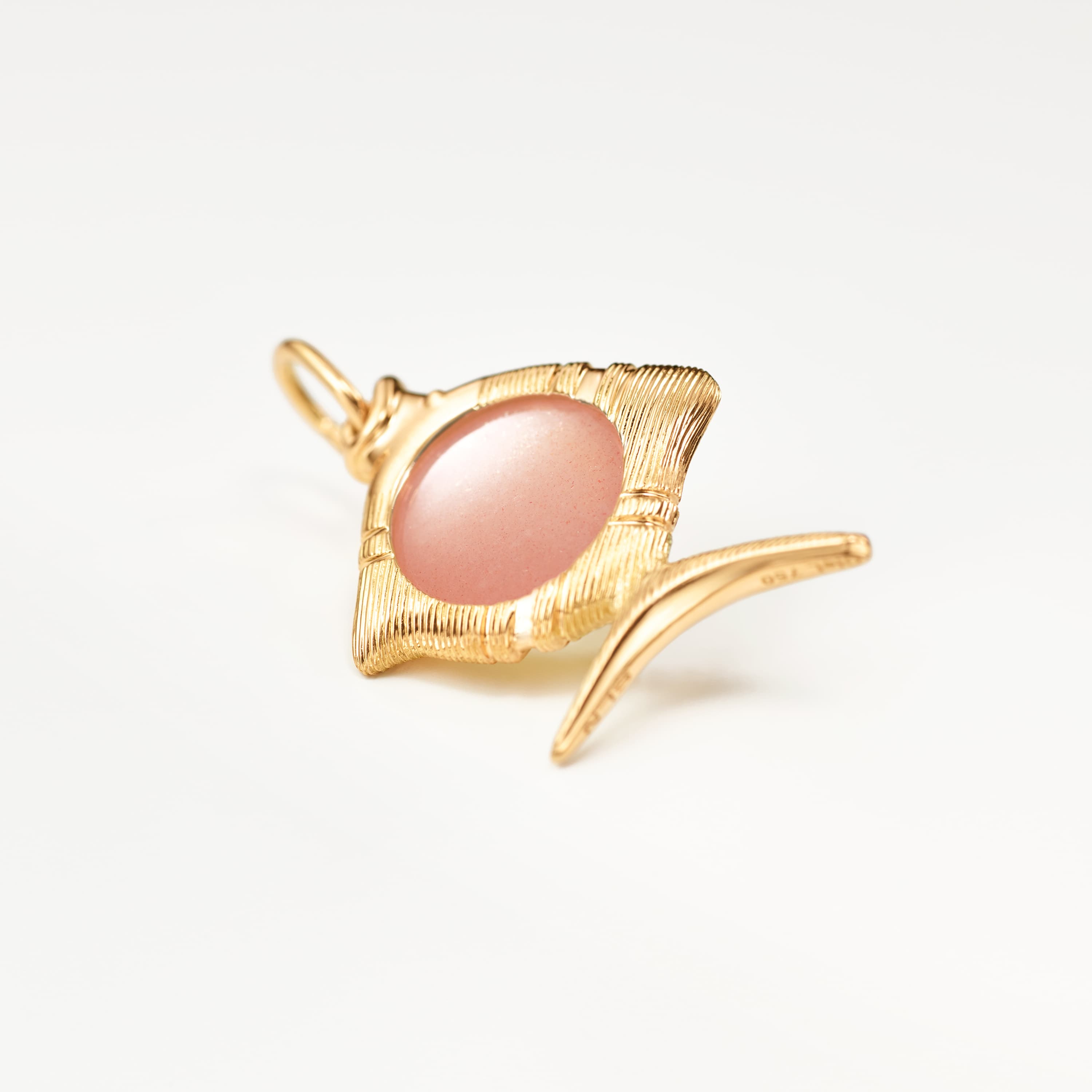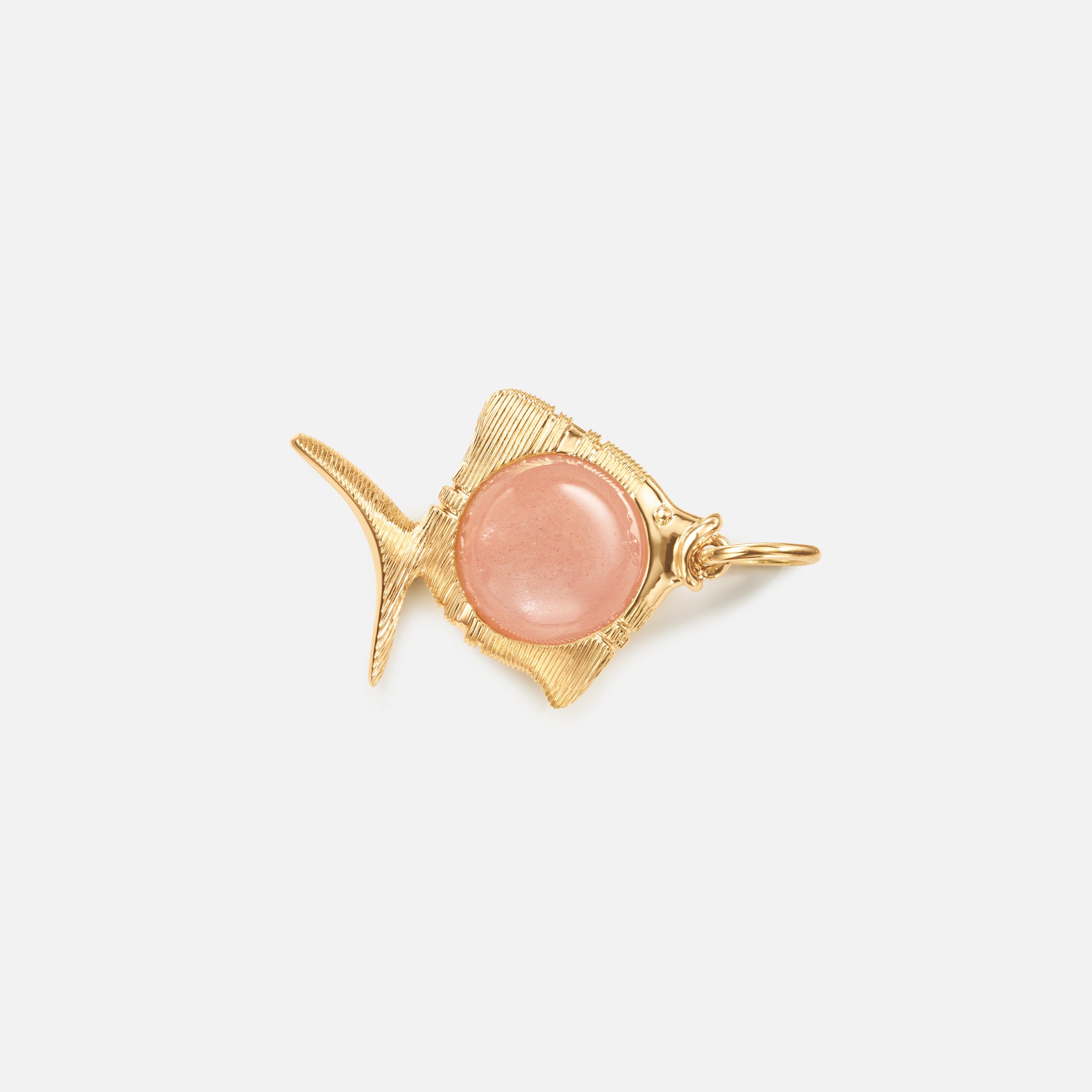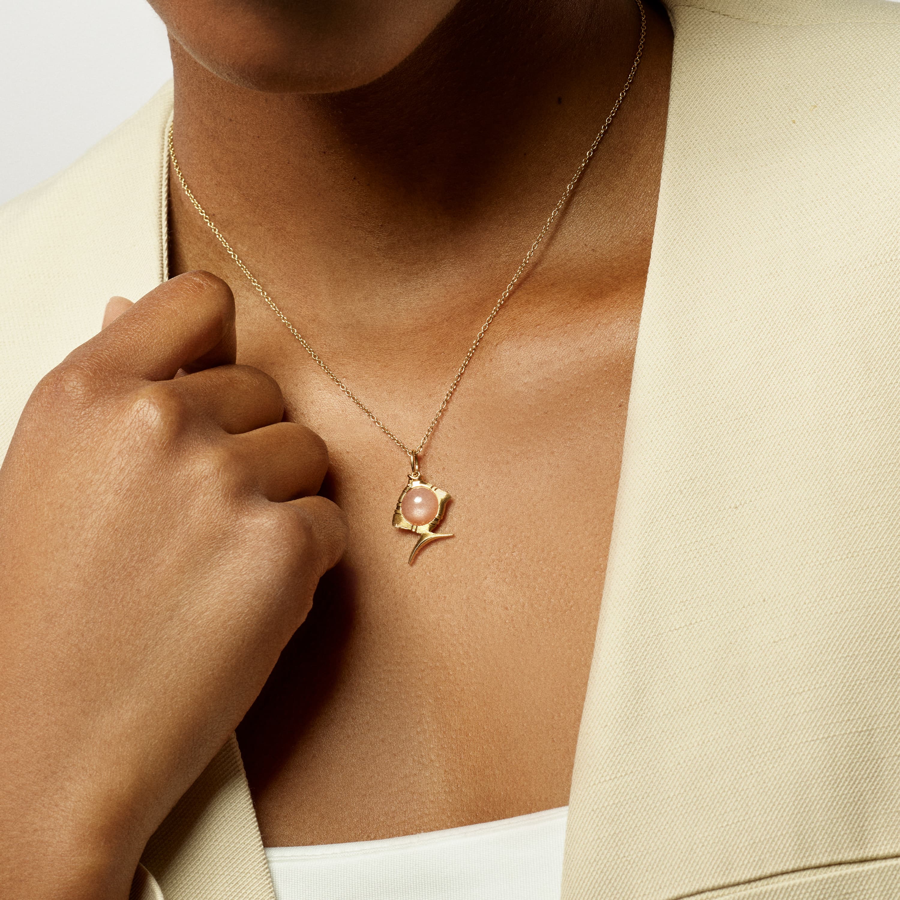 This Young Fish pendant, designed by Sofia Lynggaard Normann, is crafted from 18 karat yellow gold and blush moonstone. The gold setting allows the pendant to be worn on various colliers and necklaces. The blush moonstone has a diameter of 9 mm. Part of The Young Fish Collection.