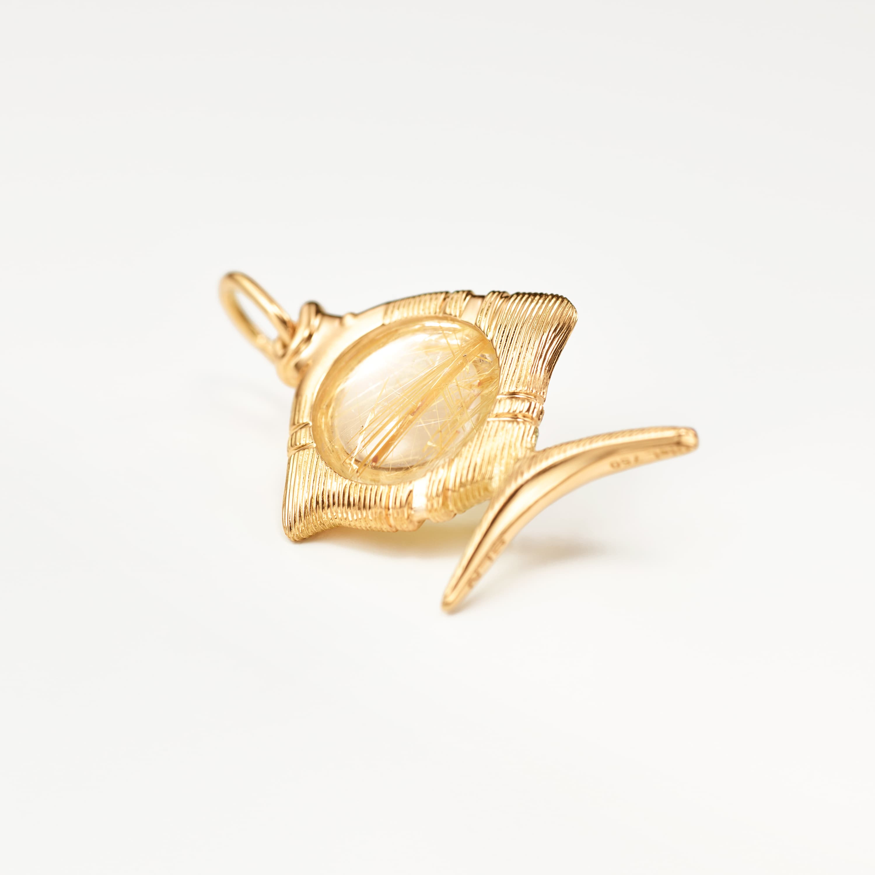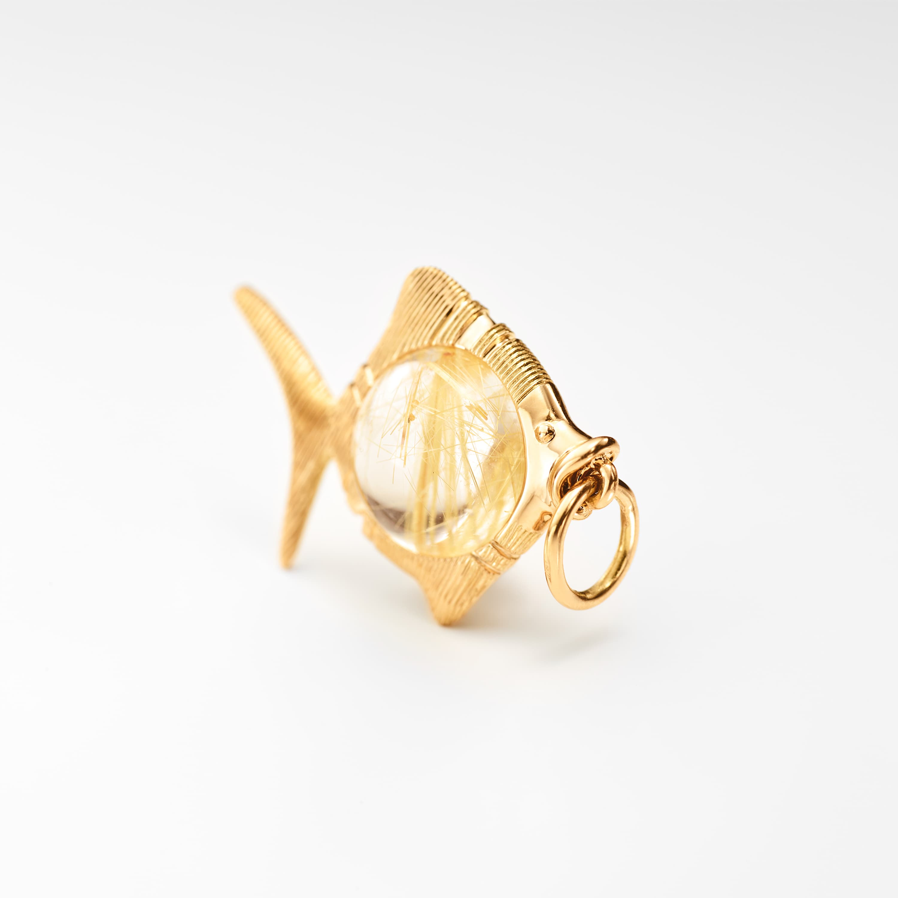 This Young Fish pendant, designed by Sofia Lynggaard Normann, is crafted from 18 karat yellow gold and rutile quartz. The gold setting allows the pendant to be worn on various colliers and necklaces. The rutile quartz has a diameter of 9 mm. Part of The Young Fish Collection.